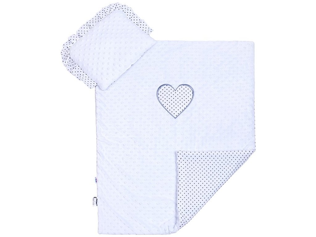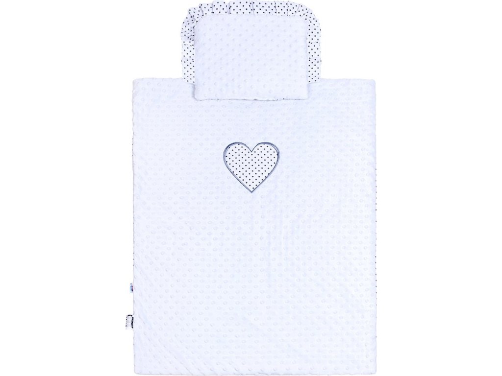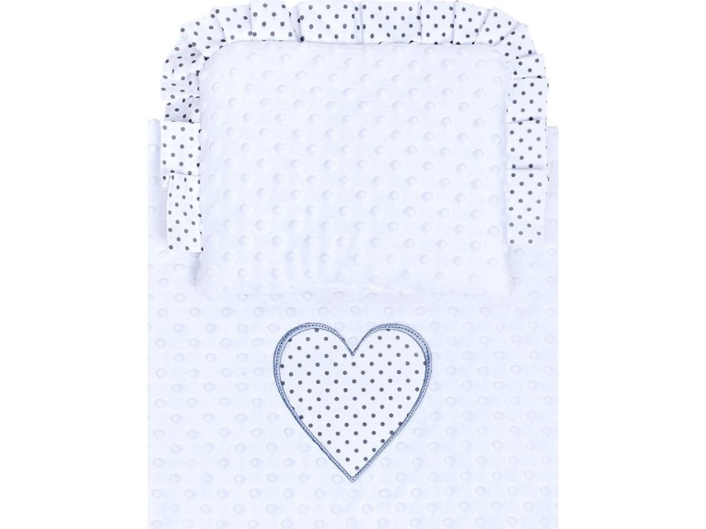 Oboustranný set z Minky New Baby do kočárku. Z jedné strany je minky materiál a z druhé strany bavlněná látka celopotištěná puntíky. Set obsahuje polštářek, který je ozdoben volánkem, a přikrývku, která má na straně minky našité krásné velké puntíkové srdíčko. Klademe důraz na kvalitu a proto jsou peřinky do kočárku ušity z velmi kvalitního materiálu, který nepouští barvu, a nevyvolává alergické reakce. Vše je vyplněno antialergickým vláknem. Složení: povlak 100% bavlna, 100% polyester, výplň 100% polyester. Rozměry: polštářek: cca 25x32 cm, peřinka: cca 82x68 cm. Tyto výrobky jsou bezpečné, protože: