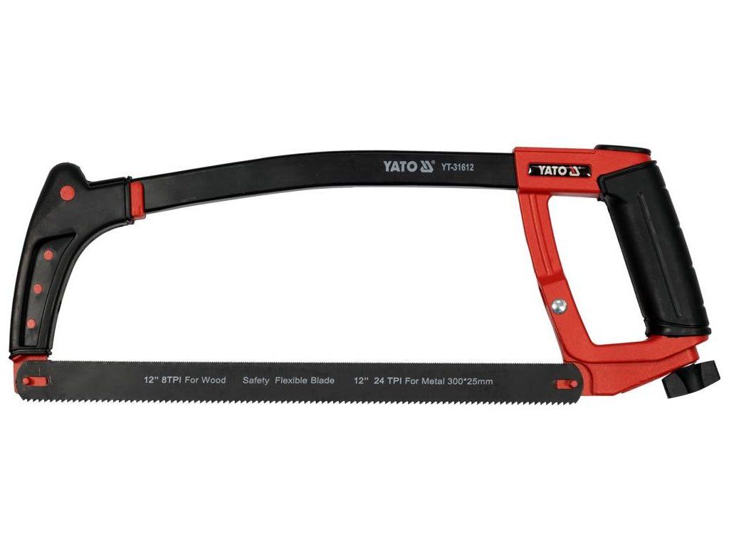 K rámu je připevněn univerzální, oboustranný pilový kotouč 300 x 25 mm s roztečí zubů 8 tpi na dřevo a 24 tpi na kov. Napnutí pilového listu pomocí šroubu umístěného pod rukojetí. Montáž listu je možná pod úhlem 90° nebo 45°.