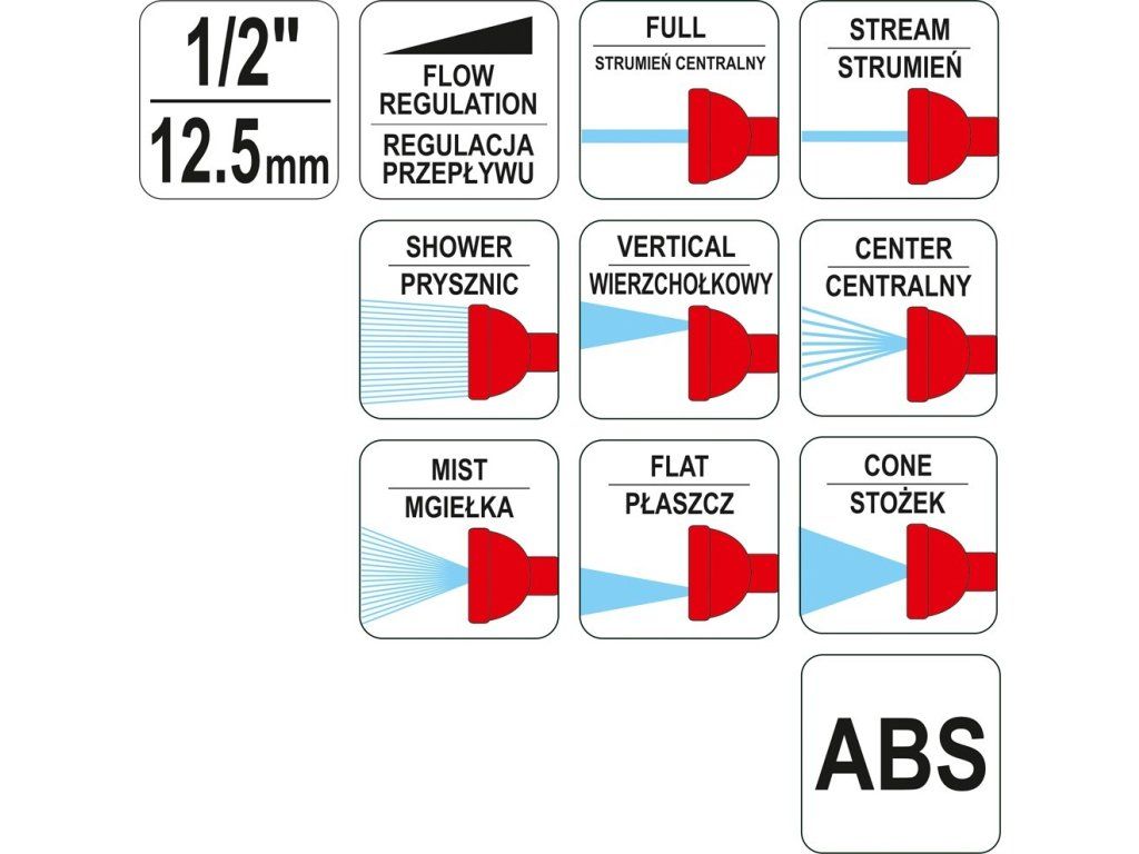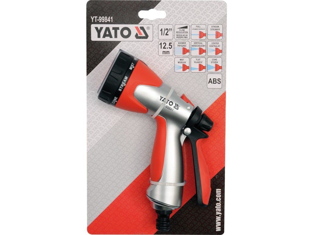 Postřikovací pistole s osmi nastavitelnými funkcemi (potok, vertikální, plný, plochý, sprcha, středový, mlha, kužel), regulací průtoku a možností uzamknutí pro trvalý průtok. Pohodlné připojení hadic rychlospojkou 1/2".