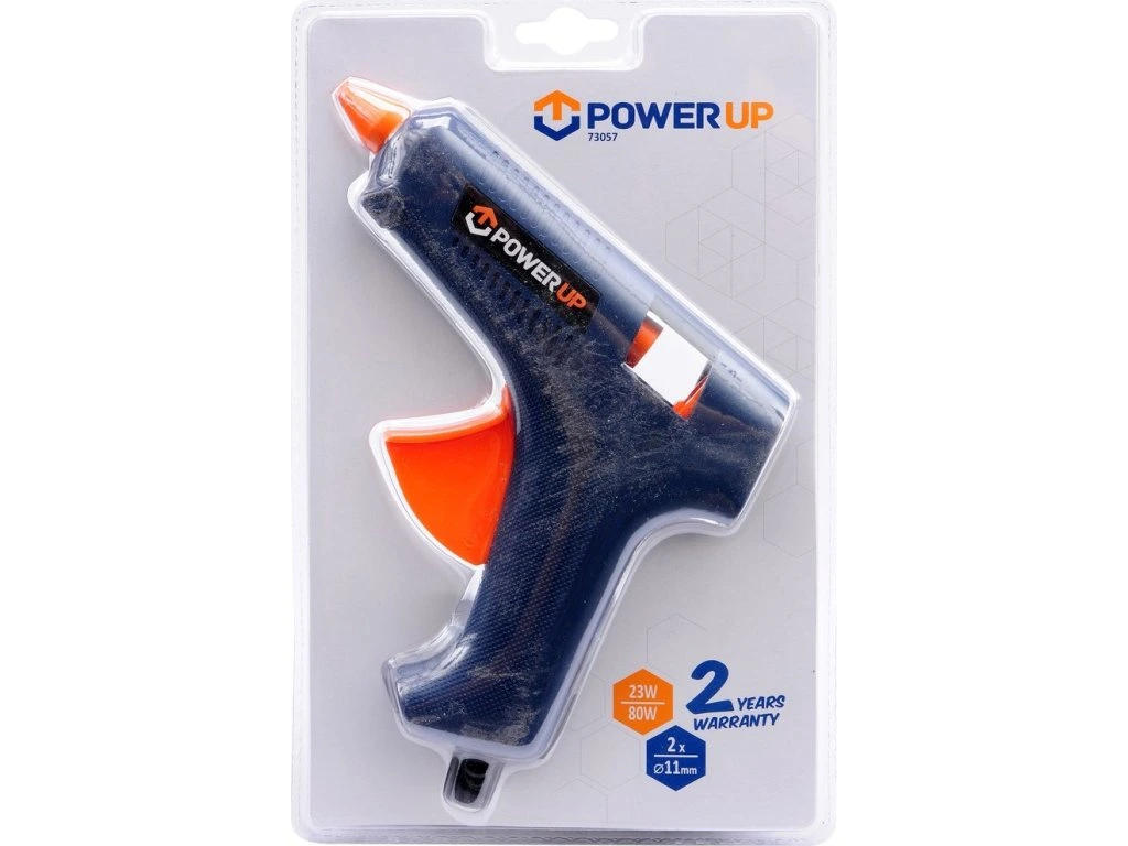 Tavná lepící pistole Power up 80 W 11 mm je výkonná pistole určená k lepení různých materiálů . Lepí plasty, dřevo, karton, sklo, keramiku, kámen, textil, korek, kovy a další materiály.