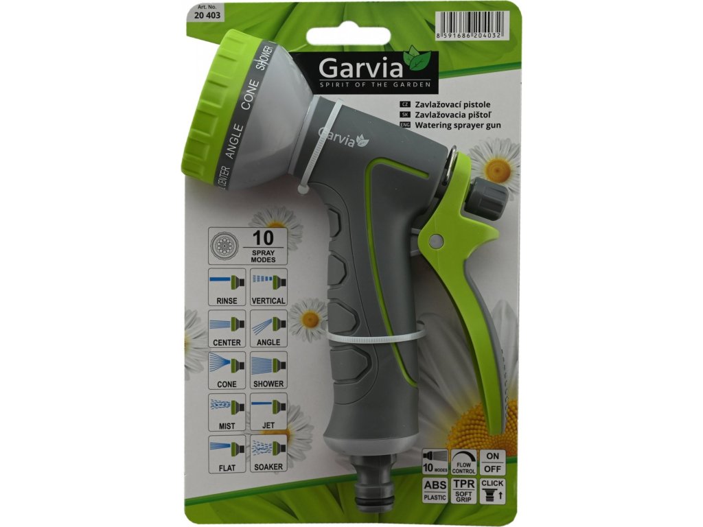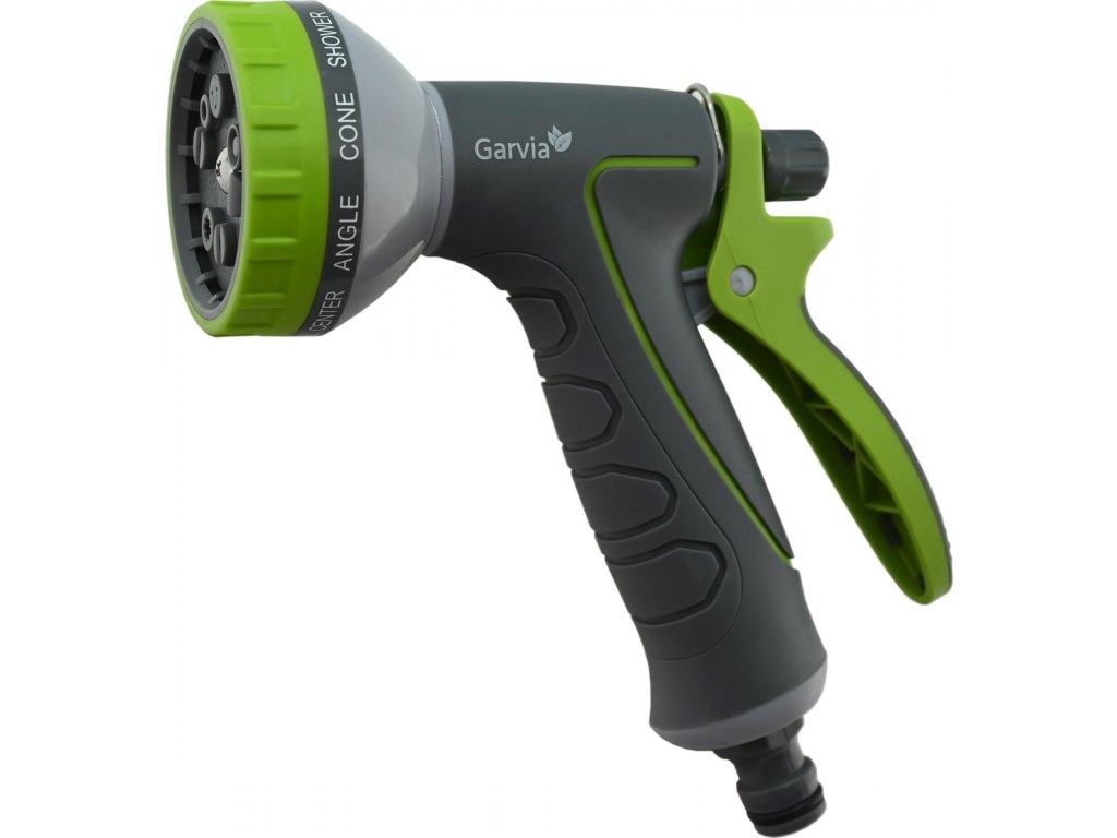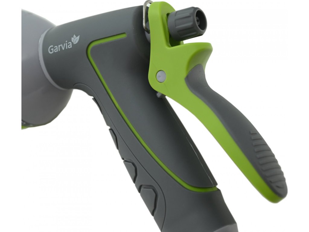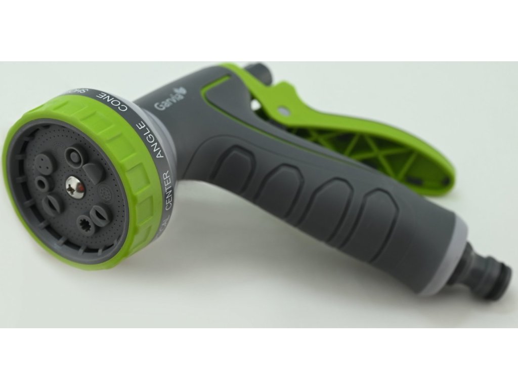 Pistole umožňuje výběr z 10 různých typů zavlažování otáčením čelní části (oplach, vertikální postřik, středový postřik, rozstřik pod úhlem, kuželový postřik, sprcha, vodní mlha, silný proud, plochý proud, smáčení). Rukojeť je opatřena spouští, díky které lze individuálně dávkovat vodu, bez plýtvání. Zároveň je možné zajistit, použitím západky, nepřetržitý průtok. Průtok samotný lze regulovat otočným prvkem na spoušti.