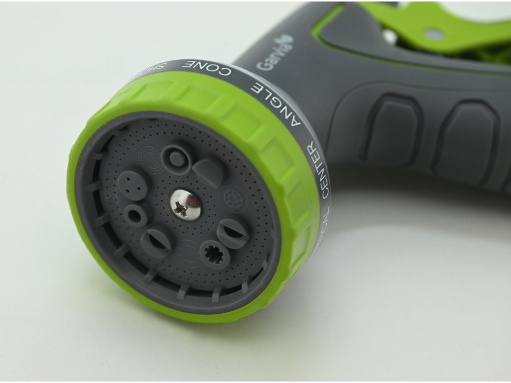 Kruhová zavlažovací pistole s deseti režimy postřiku a ergonomickou spouští.