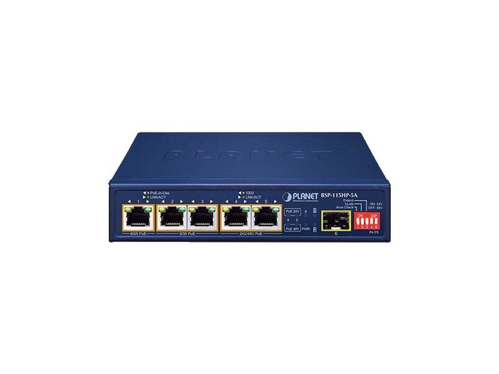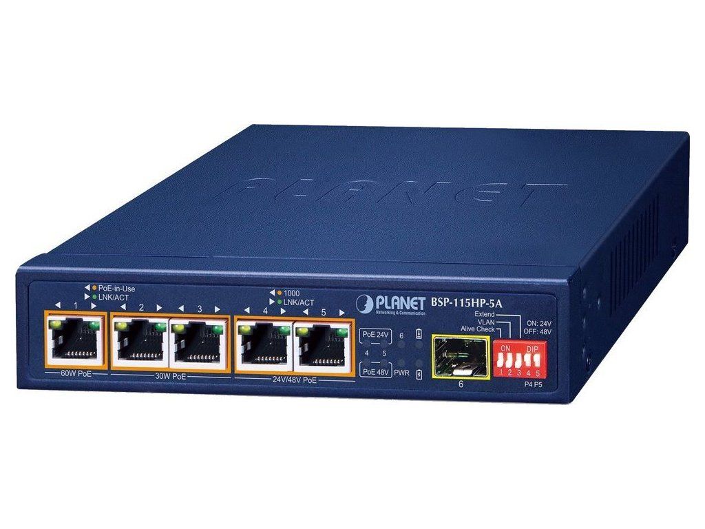 Planet BSP-115HP-5A Hybridní PoE solární switch, 5x 1Gb, 1x SFP, 1x PoE++ 802.3bt, 2x 802.3at, 2x at/pasivní, -20~65°C