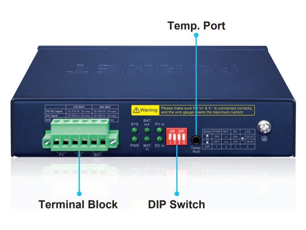 1/2 piny pro PV (fotovoltaické) panely + některé typy generátorů (vodní či větrné), piny 3/4 pro DC napájení, piny 5/6 pro nabíjení/vybíjení baterie. K dispozici je DIP switch na přední straně, pomocí kterého lze konfigurovat PoE a VLAN. DIP switch na zadní straně pak slouží k nastavení typu a napětí baterie.