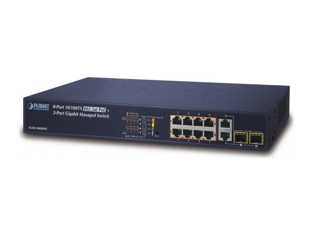 PLANET FGSD-1008HPSPoE switch se 2 SFP porty 1000Base-X (sdílené s 9. a 10. portem), 8 RJ-45 porty 10/100Base-TX s možností napájení dalších IEEE 802.3af/at zařízení a celkovým napájecím výkon 125 W.