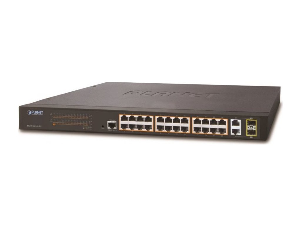 PLANET FGSW-2624HPS24 portů 10/100Base-TX Ethernet portů s integrovanými IEEE 802.3at/af PoE injektory, výkon napájení do 220W, midspan. 2x porty 1000base-T a 2x SFP (miniGBIC).