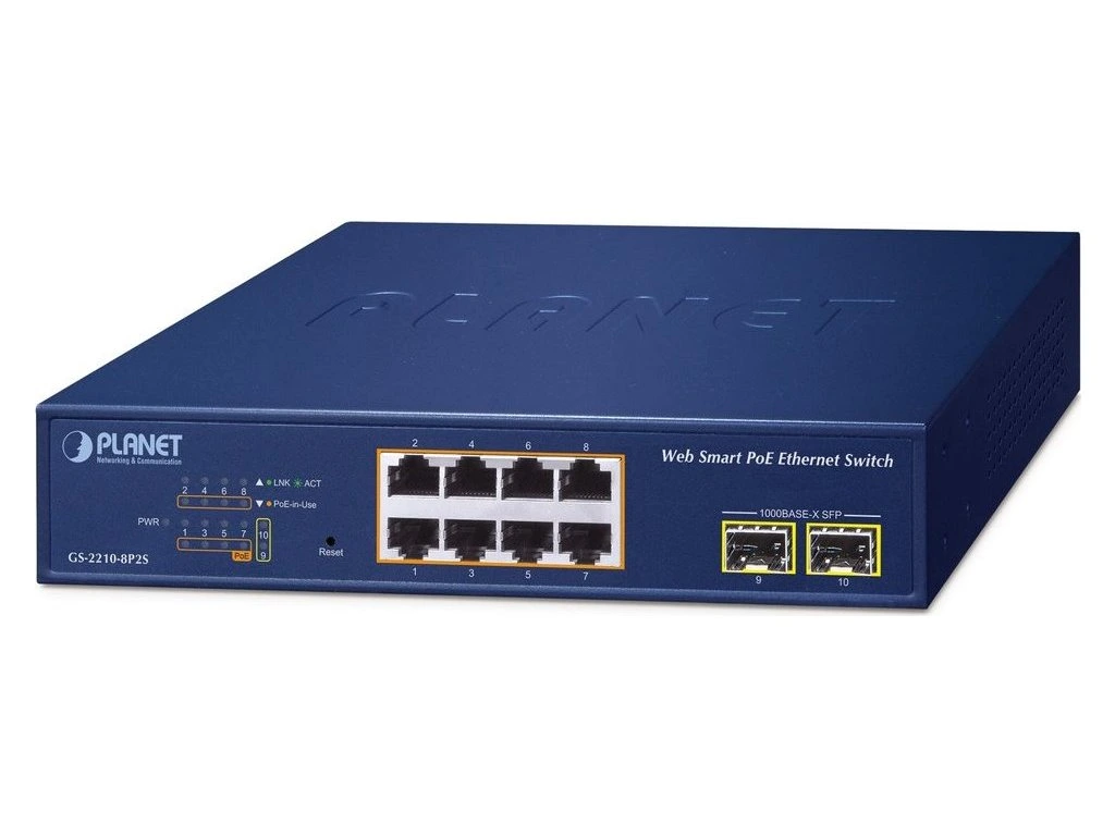 PLANET GS-2210-8P2SSpravovatelný PoE+ switch nabízející 8 portů 10/100/1000 Base-T a 2 SFP sloty 100/1000 Base-X. Všechny RJ-45 porty podporují napájení 802.3at PoE+ s celkovým výkonem až 120 W.