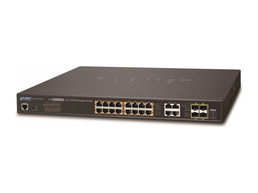PLANET GS-4210-16P4CSpravovatelný PoE přepínač 20 portů 1000Base-T, 16x injektory 802.3at, výkon až 220W, 4x SFP porty 100/1000Base-X (sdílené s 17-20).