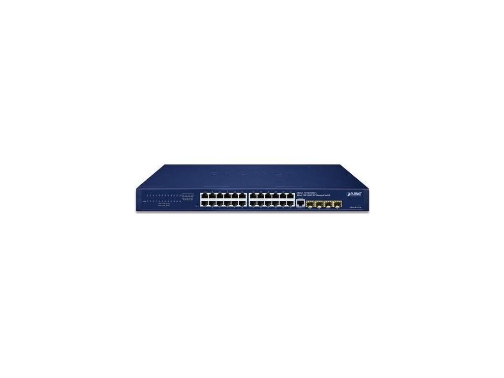 PLANET GS-4210-24T4SSpravovatelný přepínač nabízí 24 portů 10/100/1000Base-T a 4 SFP sloty 100/1000Base-X.