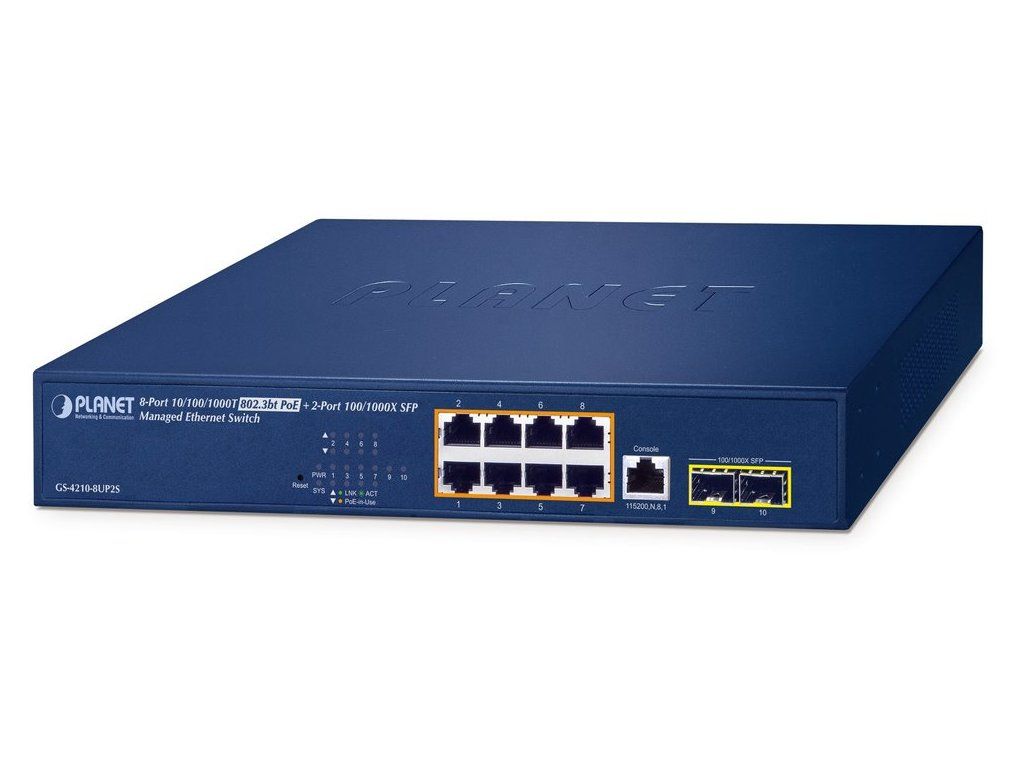 PLANET GS-4210-8UP2SSpravovatelný PoE++ switch nabízí 8 portů 10/100/1000 Base-T a 2 SFP sloty 100/1000 Base-X. Všechny RJ-45 porty podporují napájení 802.3at PoE+ s celkovým výkonem až 180 W.