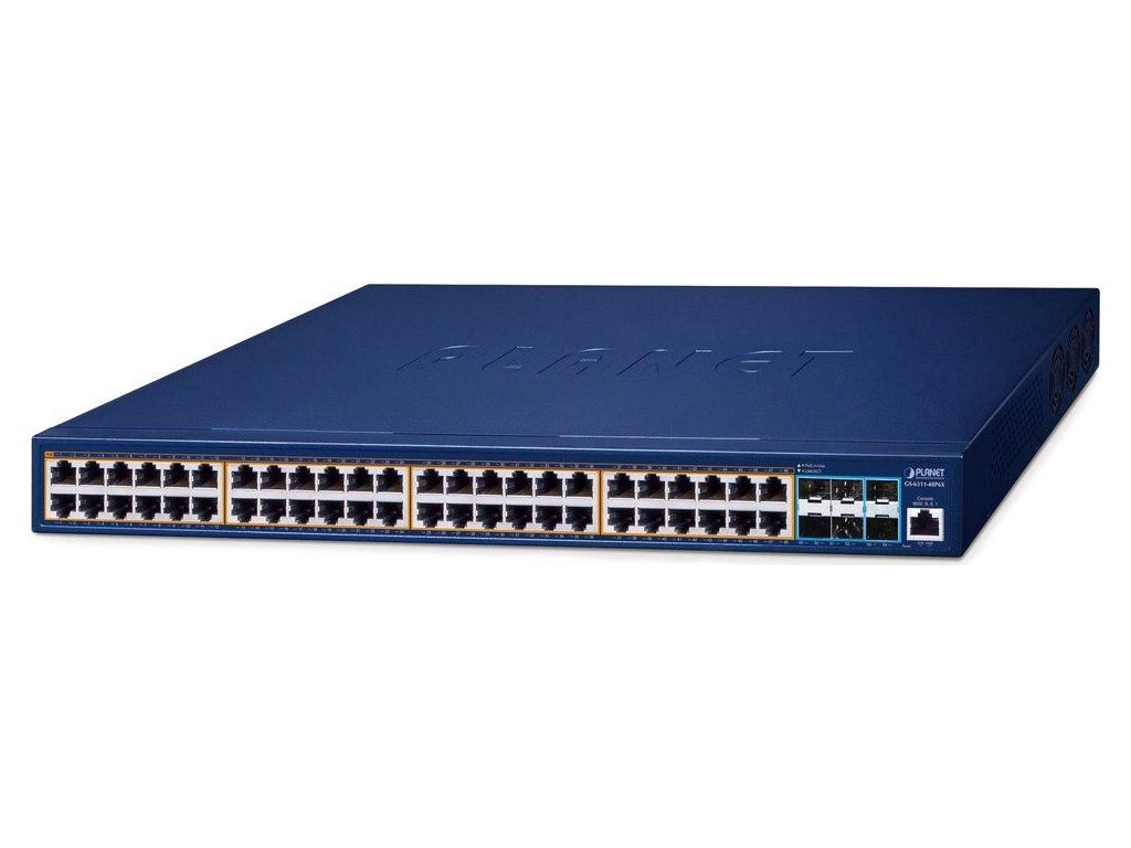 PLANET GS-6311-24HP4XSpravovatelný multigigabitový L3 přepínač s PoE+ napájením (802.3af/at), 48× 10/100/1000 Base-T RJ-45 PoE+, PoE napájení až 600 W, 6× 10G Base-X SFP+.