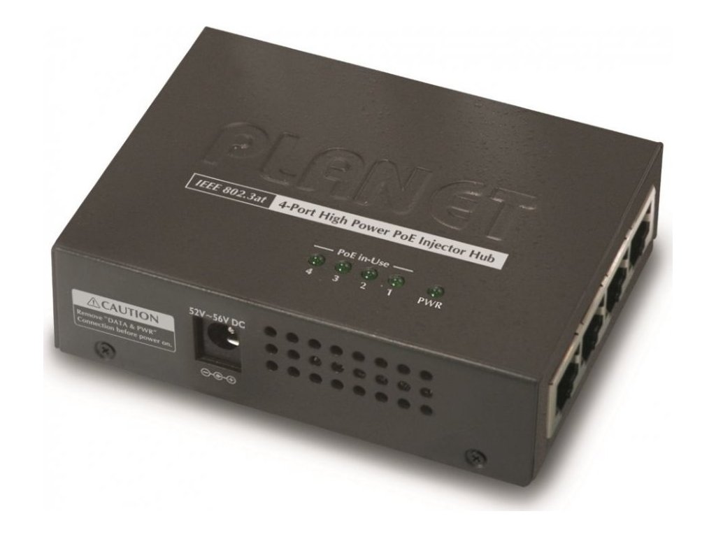 PoE (power over ethernet) Injektor HUB pro napájení zařízení po ethernetu podle IEEE 802.3af a vícepříkonových zařízení IEEE 802.3at. Je nevržen pro napájení zařízení jako jsou PTZ nebo Speedome IP kamery nebo WiFi přístupové body. K dispozici jsou celkem 4 porty s celkovým výstupním výkonem 120W, injektor je průchozí, napájení přidružuje na již stávájící ethernet Cat5/5e/6 vedení.