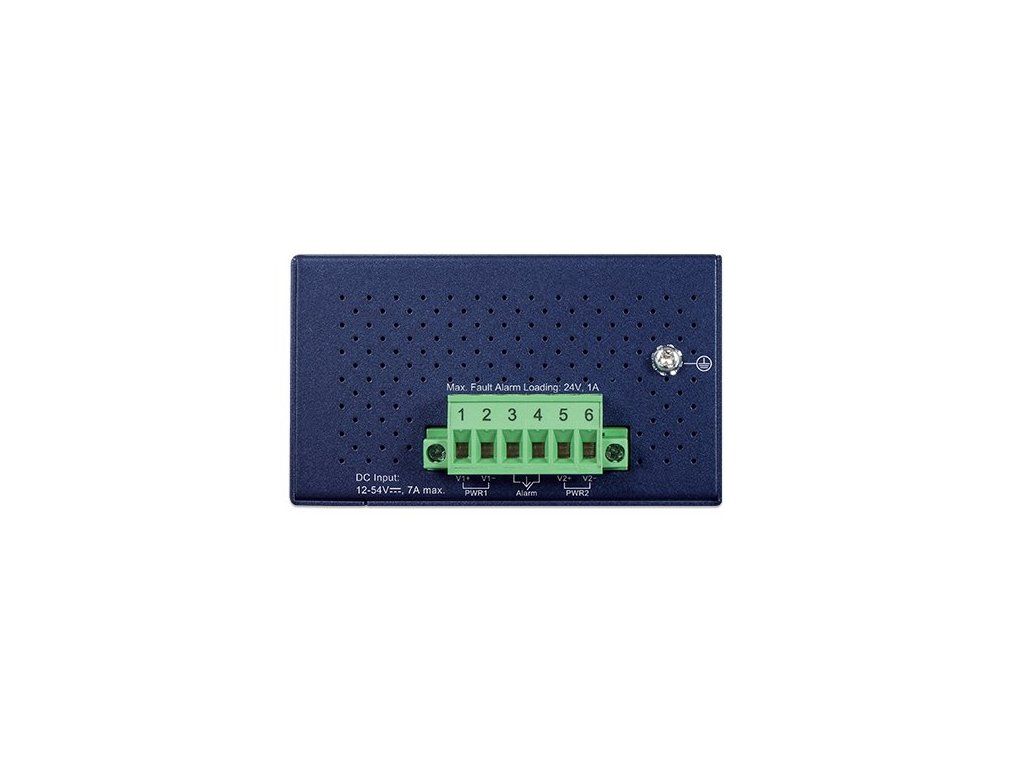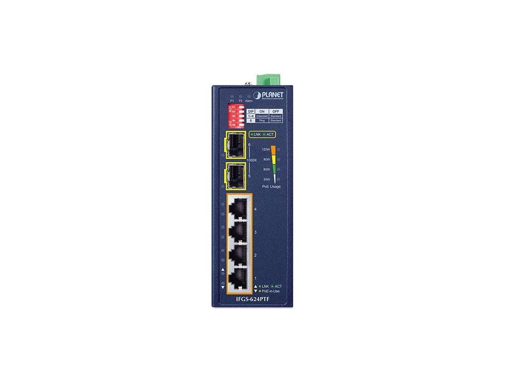 PLANET IFGS-624PTFNespravovaný průmyslový L2 PoE switch se 4× 10/100 Base-TX RJ-45 a 2× 1000Base-X SFP. Porty 1–4 podporují PoE+ napájení (802.3at), s celkovým výkonem až 120 W.