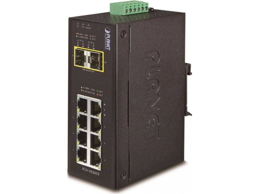 PLANET IGS-1020TFPrůmyslový přepínač a konvertor 8x 10/100/1000Base-T, 2x SFP 100/1000Base-X. Energeticky efektivní dle 802.3az.