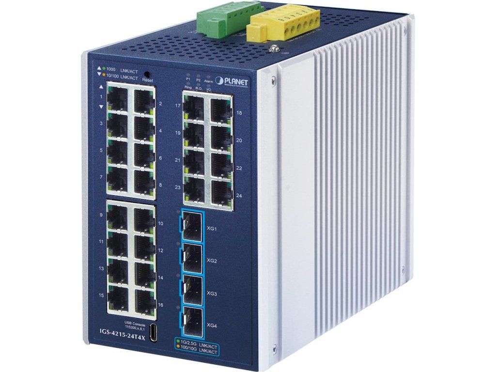 PLANET IGS-4215-24T4X představuje výkonné síťové řešení navržené pro provoz v nejnáročnějších průmyslových prostředích. Switch kombinuje 24× 10/100/1000Base-T RJ-45 portů s 4× 10GBase-X SFP+ sloty, které podporují zpětnou kompatibilitu s 1G/2.5G moduly. Díky robustnímu hliníkovému pouzdru s krytím IP30 a fanless designu zajišťuje spolehlivý provoz v teplotním rozsahu -40 až +75 °C bez nutnosti aktivního chlazení.