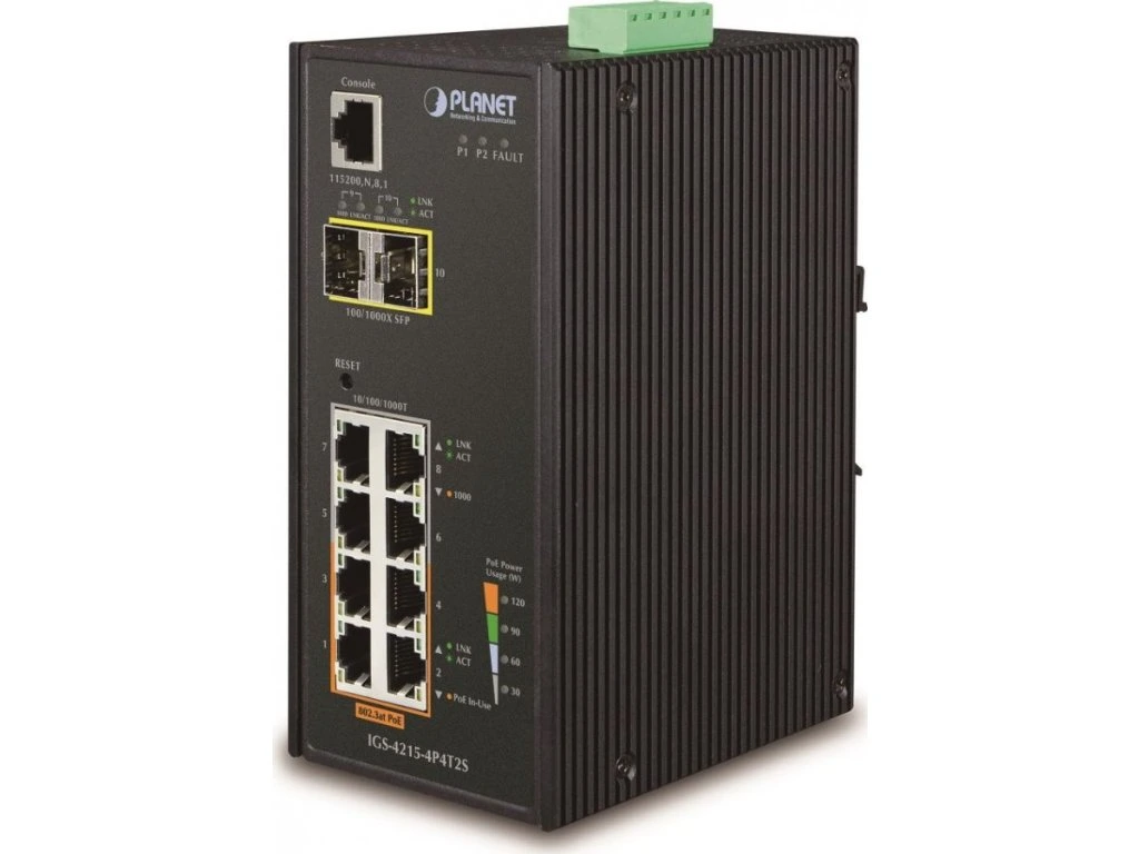 PLANET IGS-4215-4P4T2SPrůmyslový spravovatelný PoE přepínač 8x 10/100/1000Base-T, z toho 4x PoE IEEE 802.3af injektory, výkon až 140W; 2x SFP 100/1000Base-X (diagnostika DDM).