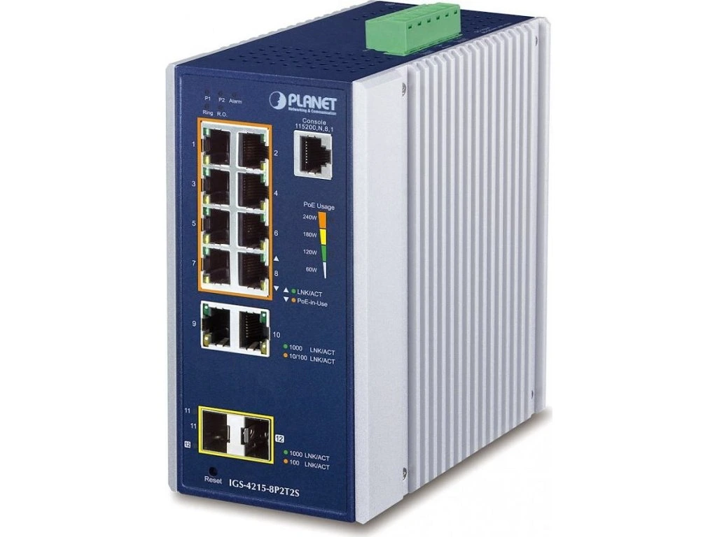 PLANET IGS-4215-8P2T2SPrůmyslový L2 PoE spravovatelný switch 10× RJ-45 10/100/1000 Base-T, 2× SFP 100/1000 Base-SX/LX/BX (diagnostika DDM). Porty 1–8 podporují PoE+ napájení (802.3af/802.3at), celkový výkon 240 W (pro max. výkon je třeba duální napájení o stejném napětí, např. 2× DC 54 V).