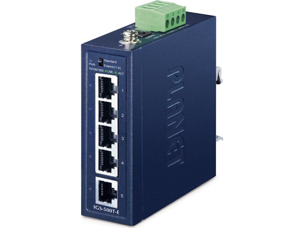 Planet IGS-500T-EKompaktní průmyslový switch nabízející 5× RJ-45 10/100/1000 Base-T porty.