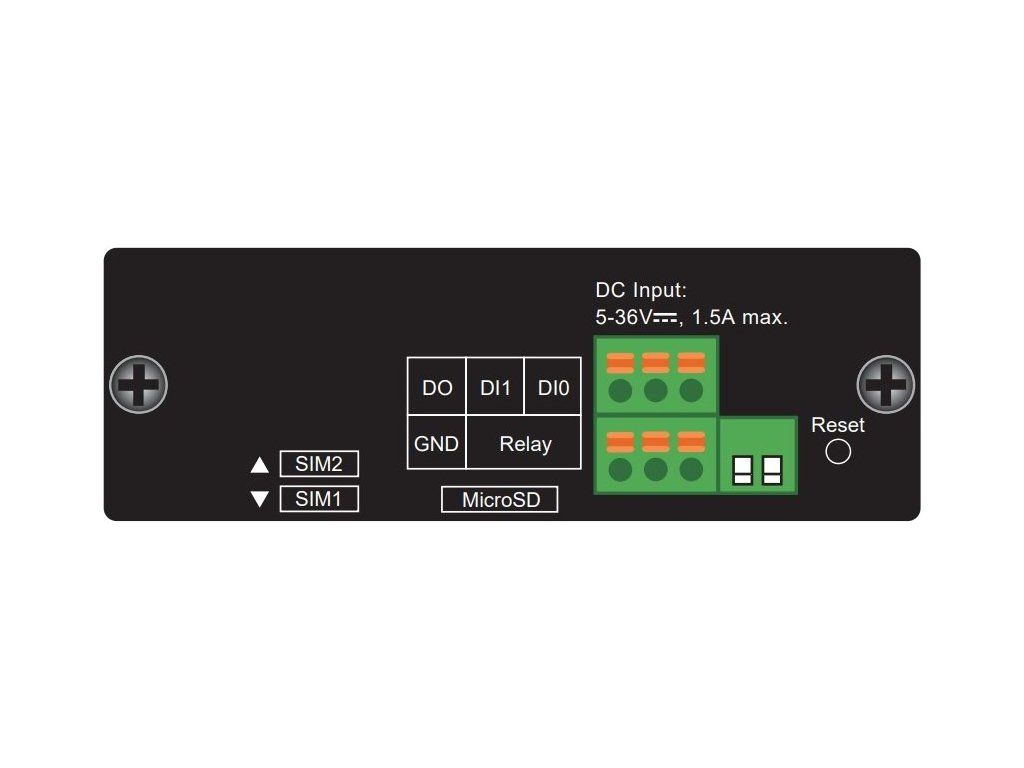 Porty: 4 x RJ-45 LAN 10/100/1000Base-T, 1 x RJ-45 WAN 10/100/1000Base-T, 1 x RJ-45 (DB9), 2 x digitální vstup, 1 x digitální výstup (alarm), 2 x SIM slot, 2 x SMA, 1 x RP-SMA-J, 1 x microSD slot