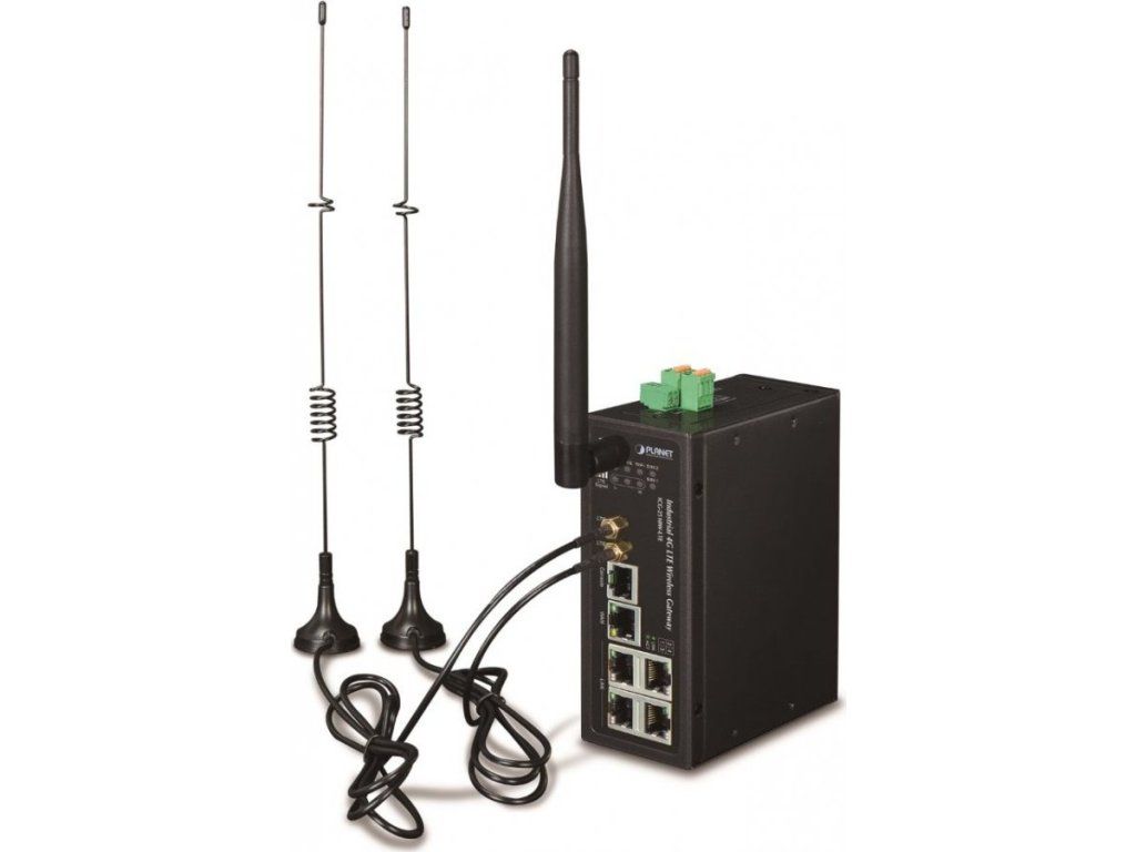 PLANET ICG-2510W-LTEPrůmyslová brána LTE infrastruktury IoT/M2M, 1x WAN, 4x LAN, 1x RJ-45 (DB9), 2x digitální vstup DI, 1x digitální výstup DO, 2x SIM slot, 2x 5dbi anténa (SMA konektory, mobilní sítě 2G/3G/4G/LTE), 1x 1dbi anténa (RP-SMA-J), 1x microSD slot.