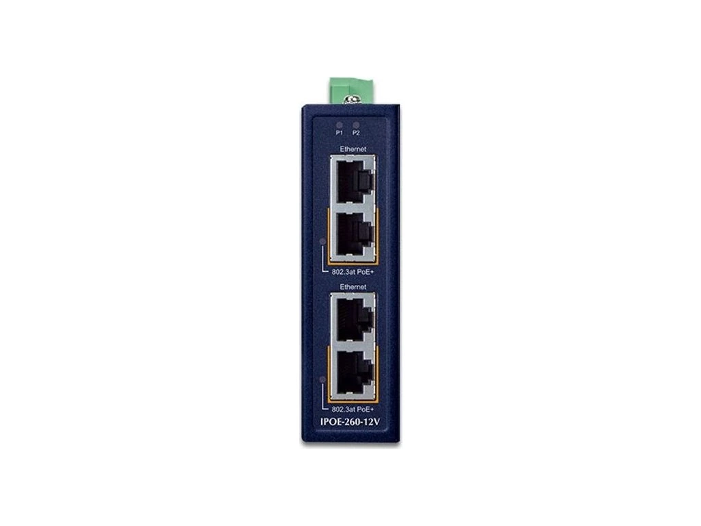 Planet IPOE-260-12V PoE průmyslový injektor, 2x port, 4x1Gb, 2x 802.3at 36/72W, DIN, IP30, -40~75°C, dual power 12-56VDC