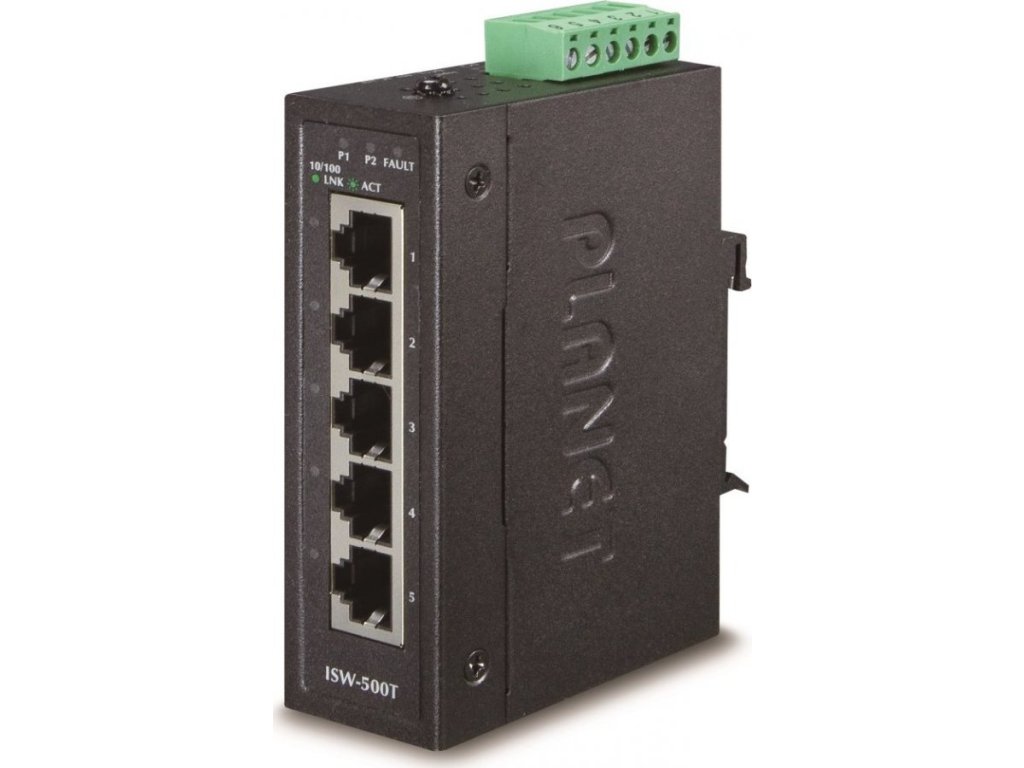 PLANET ISW-500T5portový 100Mbitový přepínač a konvertor pro průmyslové aplikace. Možnost redundantního napájení DC 12-48V / AC 24V, příkon <2W.
