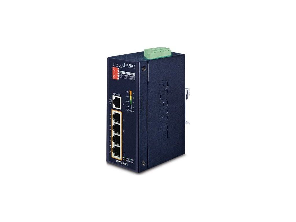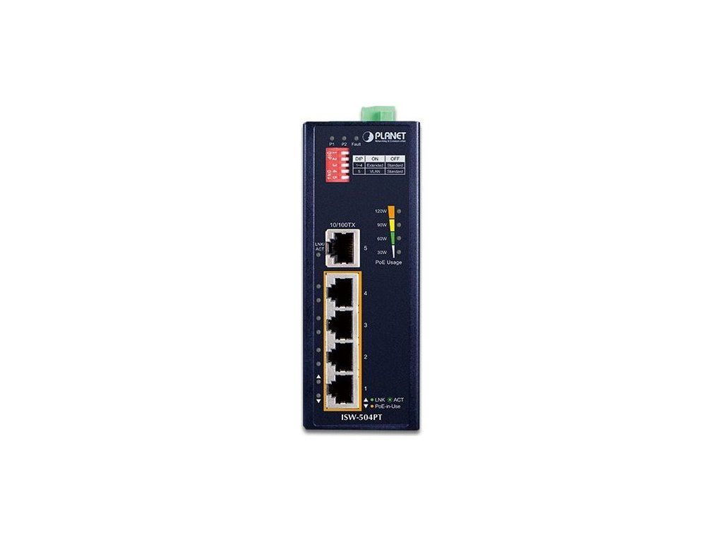 PLANET ISW-504PT v3Průmyslový přepínač PoE+ (802.3af/at), 4x RJ-45 port 10/100 Base-TX s PoE+ injektory (až 36 W/port), 1x RJ-45 10/100 Base-TX (bez PoE), celkový výkon 120 W (při napájení DC 48 V).