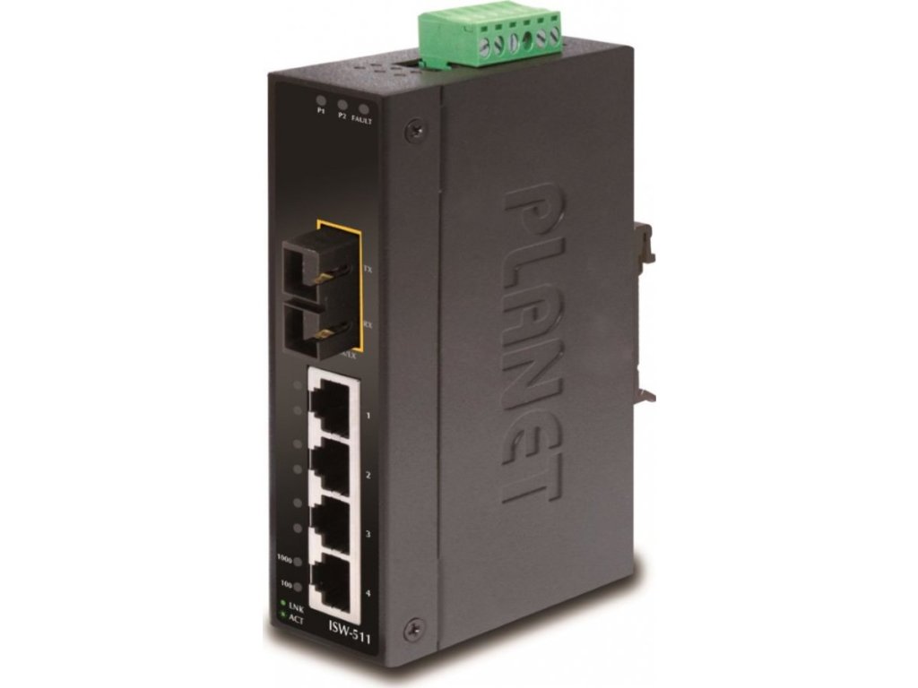 PLANET ISW-5115portový přepínač a konvertor pro průmyslové aplikace. 4 porty 10/100Base-TX, 1 optický port 100Base-FX, SC konektory, multimode, 1310nm, dosah 2km.