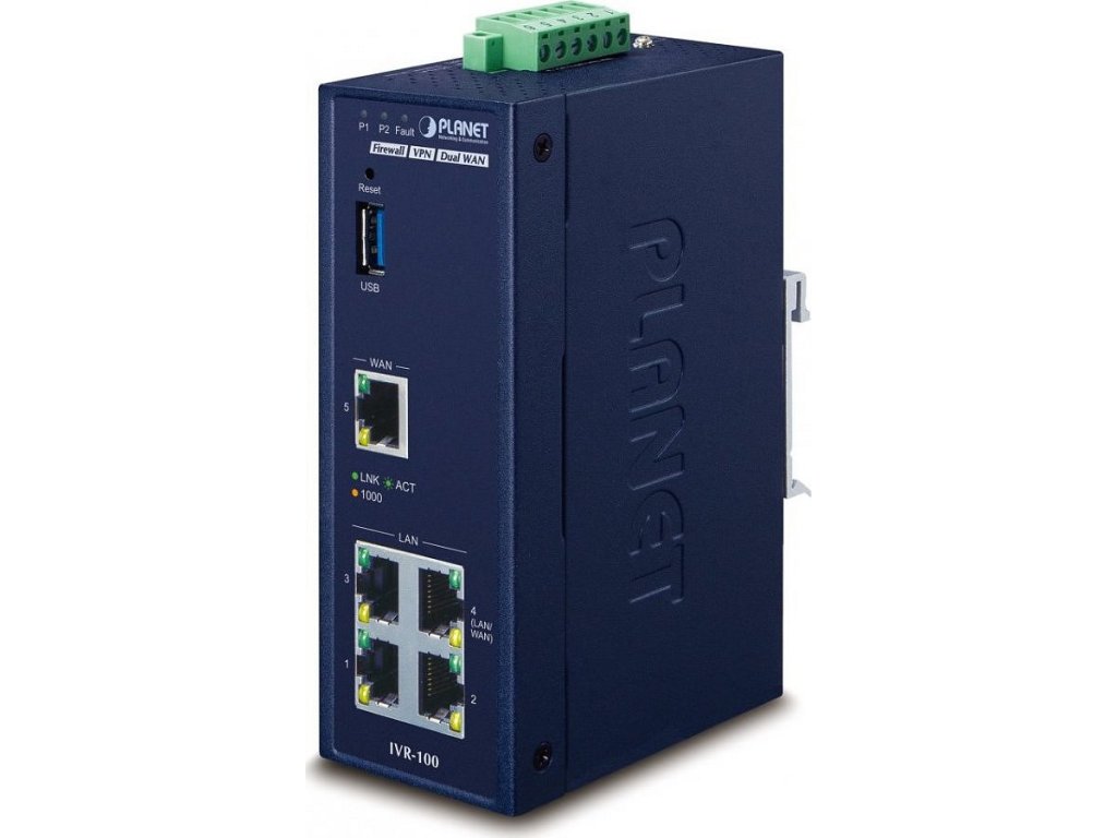 PLANET IVR-100Průmyslový gigabitový router disponující pěti RJ-45 porty pro definici WAN/LAN/DMZ se snadným a rychlým nastavením pomocí webového rozhraní. Zařízení s profesionálním firewallem umožňující vícenásobné připojení k internetu s možností rozdělení zátěže nebo vytvoření zálohy pro připojení. Je ideálním zařízením s firewallem a podporou SD-WAN pro střední a malé společnosti, kterým poskytne redundantní spojení k internetu, zároveň řeší aplikace bezpečného vzdáleného připojení k vzdáleným sítím a ochranu před útoky z internetu, disponuje pokročilým firewallem s detekcí nestandardních IP provozů, dále možností řízení přenosového pásma pomocí pravidel QoS a statistikou přenesených dat. Spojení mezi lokálními sítěmi nebo pro externí klienty zajistí integrovaný VPN server, šifrování podporuje integrovaný hardware akcelerátor.
