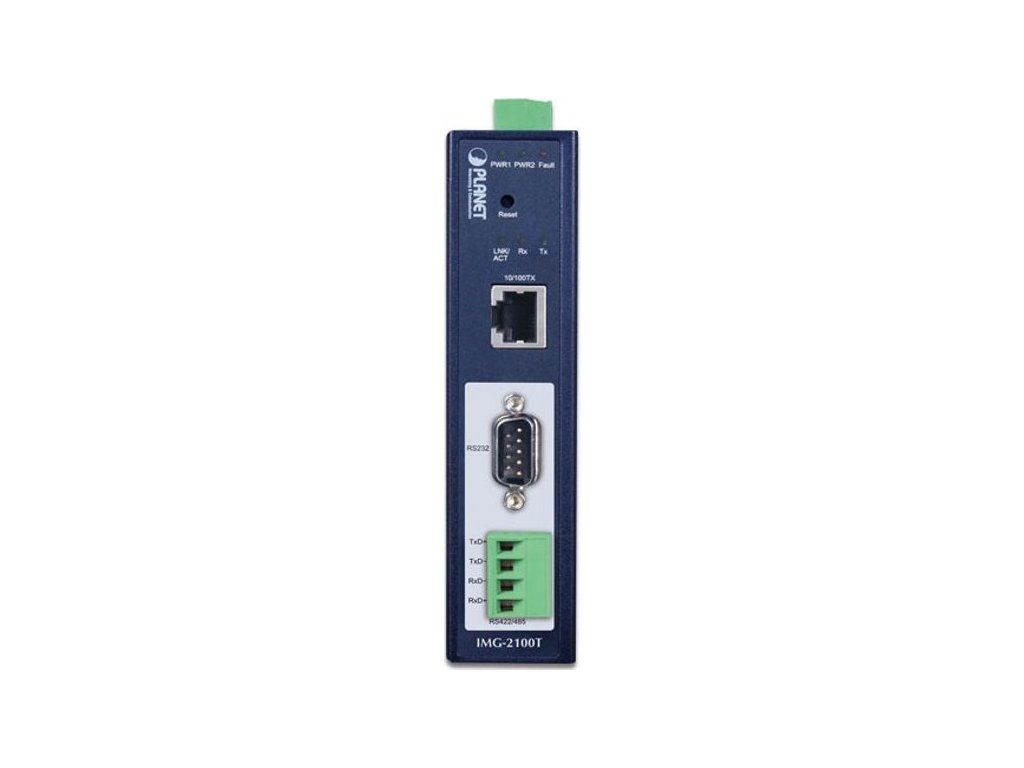 PLANET IMG-2100TPrůmyslová brána MODBUS s konverzí 1x RS-232 (DB9) + 1x 4pin svorkovnice RS-485/422 na TCP/IP protokol (RJ-45 port 100Base-TX). Typ sériové komunikace je volitelný RTU/ASCII, master/slave.
