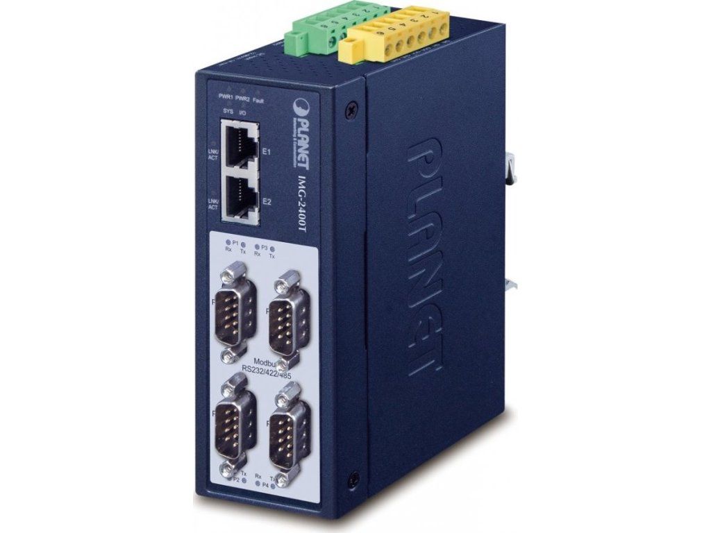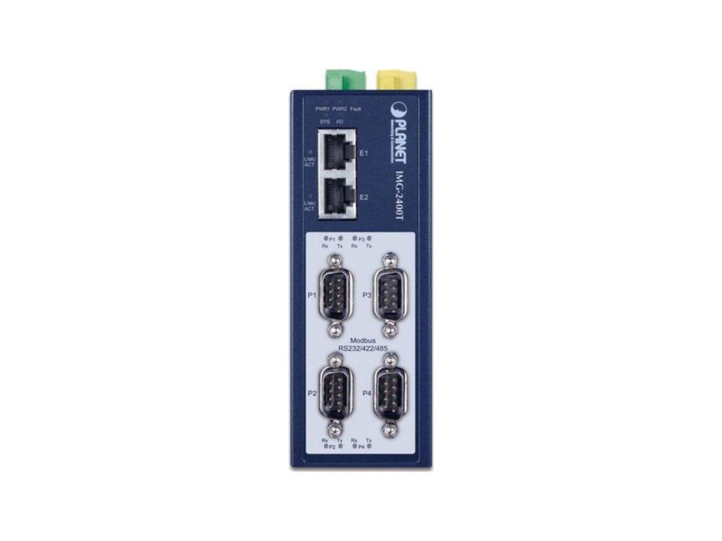 PLANET IMG-2400TPrůmyslová brána MODBUS s konverzí 4x RS-485/422/232 (DB9) na TCP/IP protokol. Typ sériové komunikace je volitelný RTU/ASCII, master/slave, DI/DO rozhraní (2x vstup, 2x výstup).