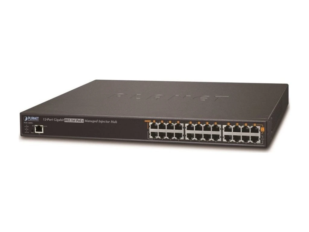 12portový gigabitový PoE injektor s plnou podporou standardů IEEE 802.3, IEEE 802.3u, IEEE 802.3ab, IEEE 802.3af a IEEE 802.3at. Zařízení napájí koncová napájená zařízení (PD-powered device) 52 V DC s celkovou zatížitelností 220 W. Instaluje se mezi klasický ethernet přepínač a napájená zařízení, tím přidružuje napětí pro provoz koncových zařízení na vedení ethernet bez efektu na rychlost přenosu dat nebo limitu na maximální vzdálenost segmentu připojení (ethernet do 100m). POE-1200G představuje řešení pro napájení 802.3af/at kompatibilních zařízení bez nutnosti instalace dodatečné kabeláže nebo napájecích zdrojů. Dovoluje tak zachovat stávající síťovou topologii.