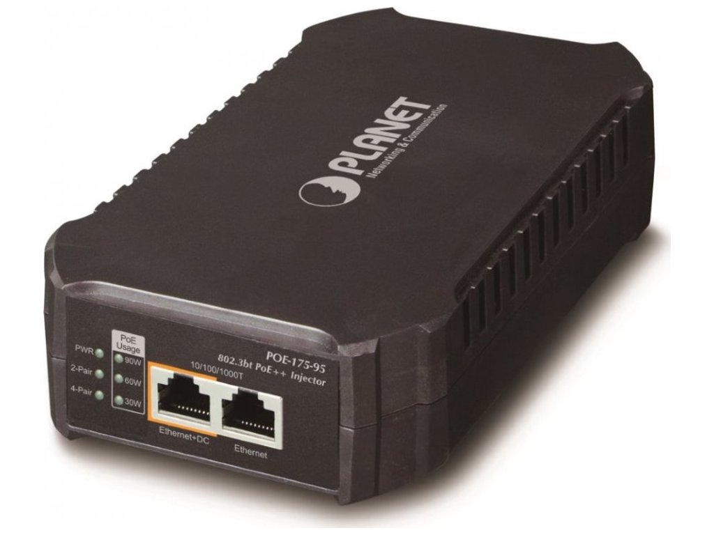 PLANET POE-175-95PoE injektor s vysokým výkonem až 95 W dle specifikace 802.3bt. Je navržen speciálně pro rostoucí požadavky odběru elektrické energie zařízeními, jak jsou například PTZ kamery, all-in-one počítače, nebo ostatní síťová zařízení požadující dostatečný přísun energie.