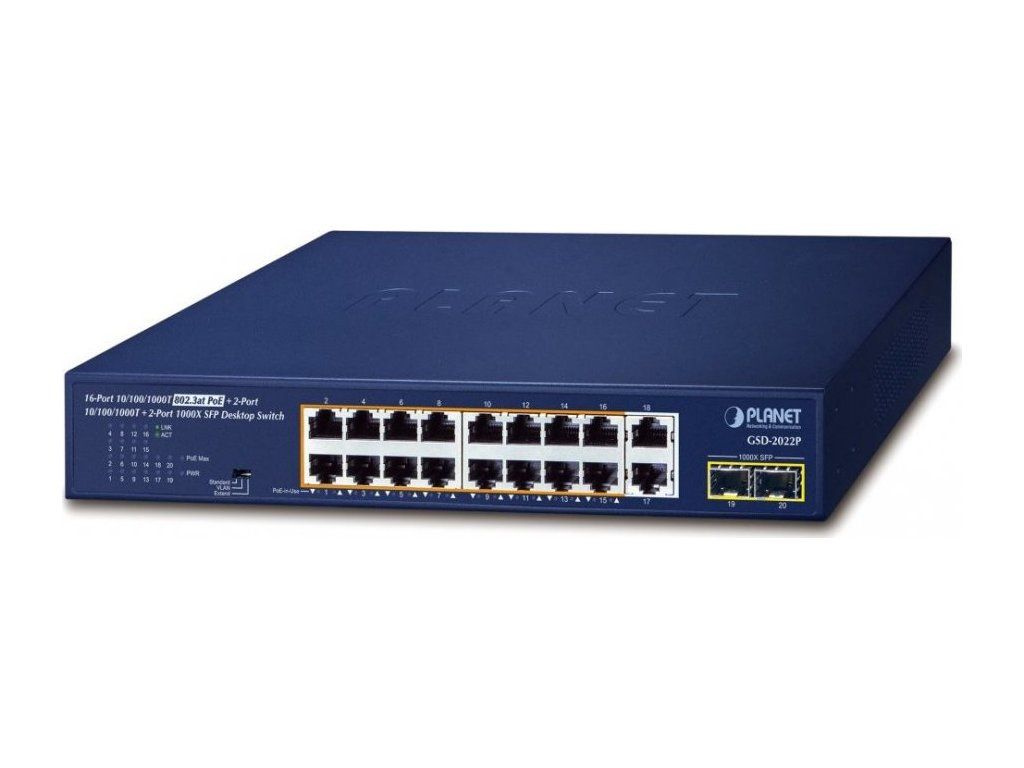 PLANET GSD-2022PGigabitový PoE+ přepínač, 18 x 10/100/1000Base-T RJ-45 s 16 injektory 802.3af/at, dva SFP sloty 1000Base-X, napájecí výkon až 185 W.