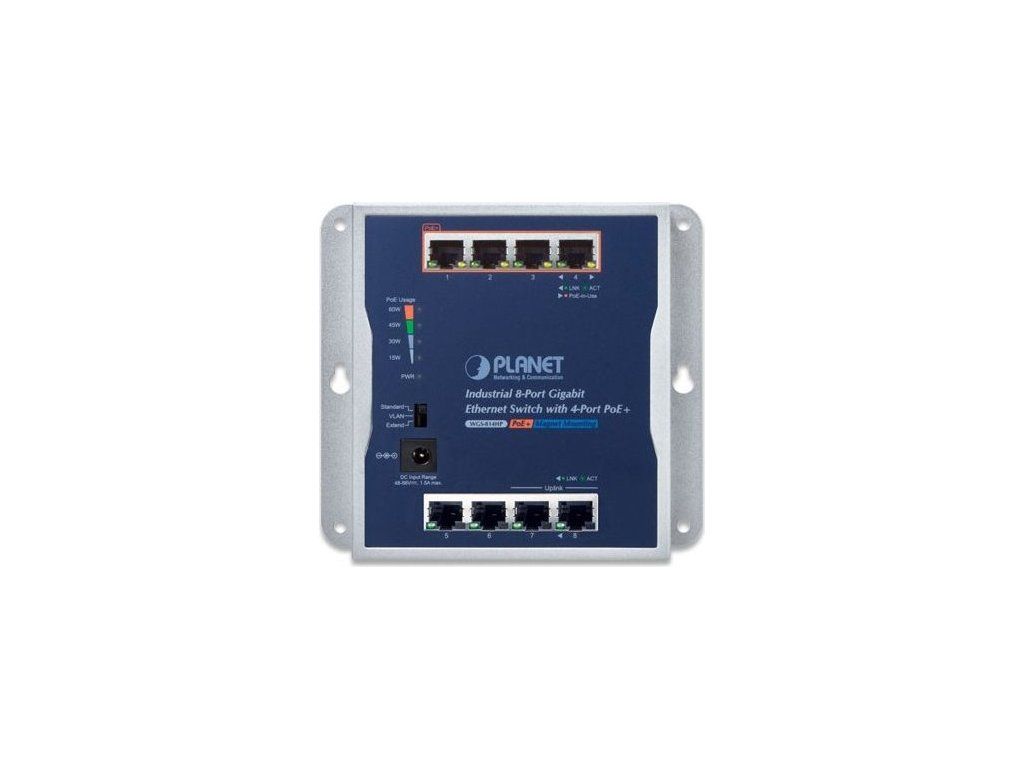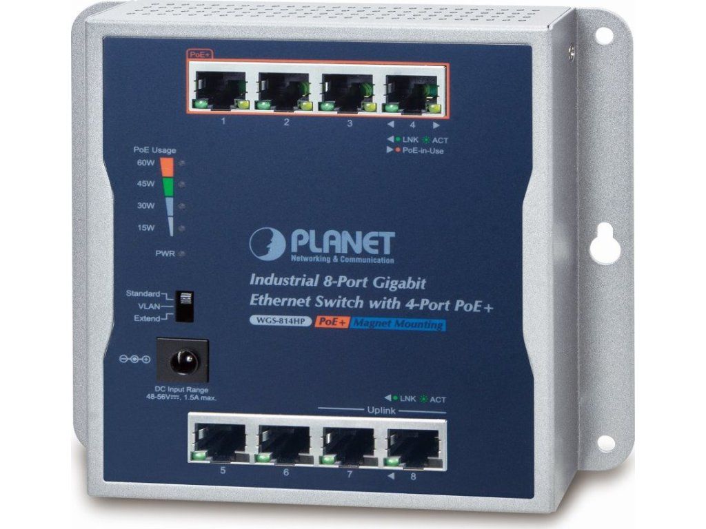 PLANET WGS-814HPGigabitový 8portový přepínač 8x RJ-45 10/100/1000 Base-T, 4 porty s PoE injektorem 802.3af/at, celkový napájecí výkon až 60 W.