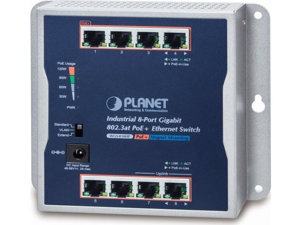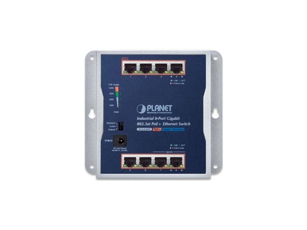 PLANET WGS-818HPGigabitový 8portový přepínač 8 x RJ-45 10/100/1000Base-T, všechny porty s PoE injektorem 802.3af/at, celkový napájecí výkon až 120 W.