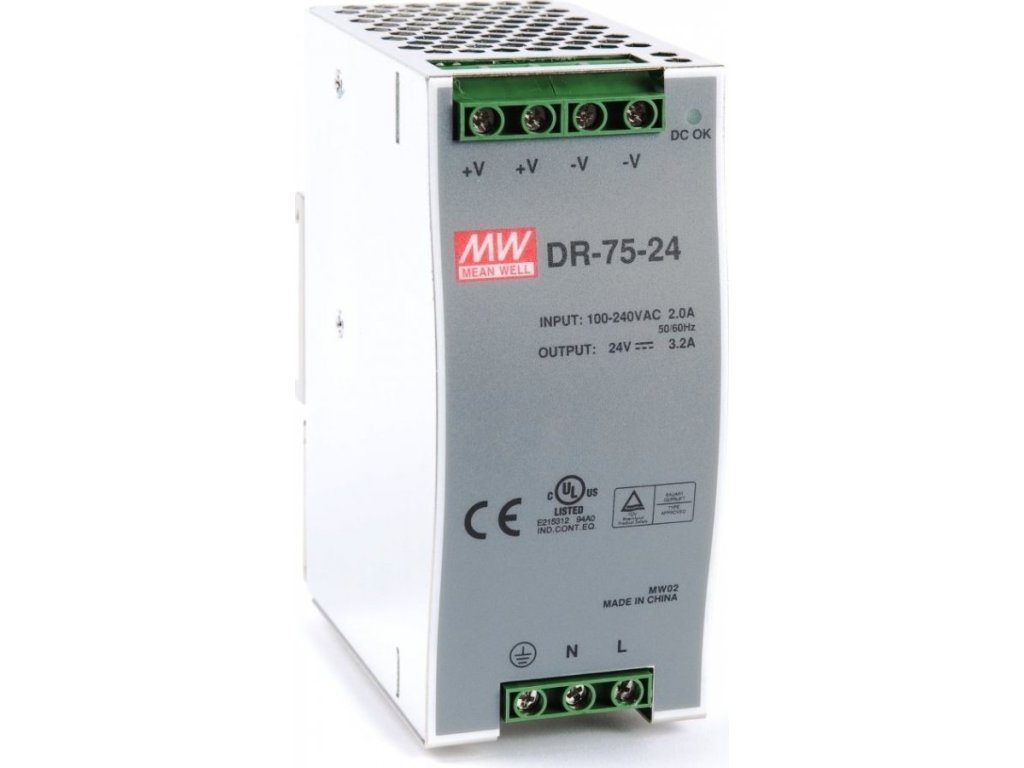 PLANET PWR-75-24Napájecí zdroj pro instalaci na DIN lištu. Výstupní napětí 24 V DC, zatížitelnost 75 W. Provozní teplota –10 až 60 °C.