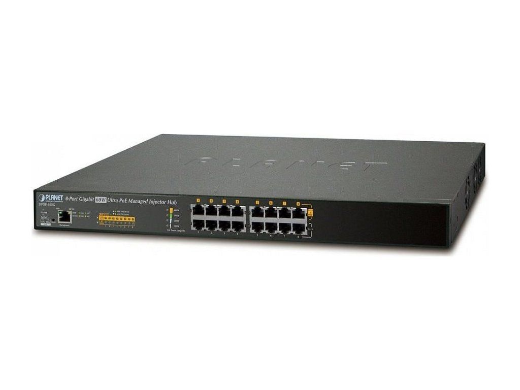 PLANET UPOE-800G8portový Ultra PoE+ injektor pro napájení po Ethernetovém kabelu. Standard IEEE 802.3at. 8 portů data-in, 8 portů data+power out.