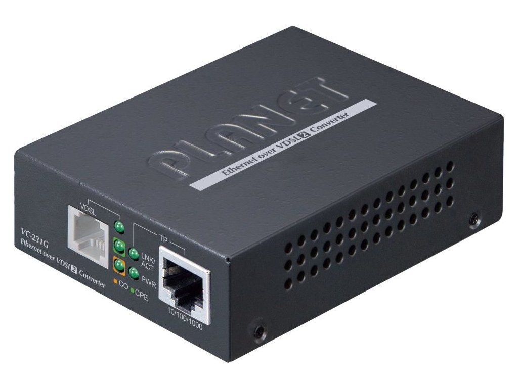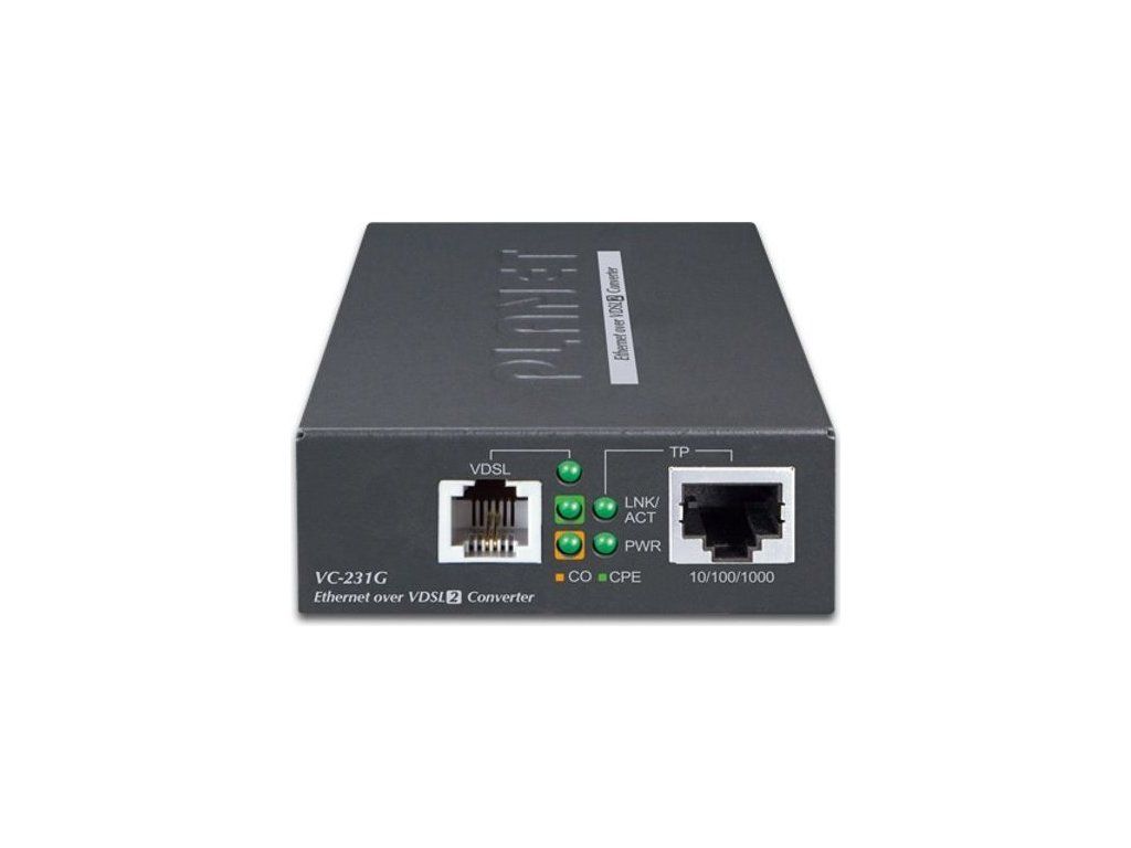 PLANET VC-231Gv2Ethernet po telefonním vedení (technologie VDSL2). 1× LAN RJ-45, 1× VDSL2 RJ-11. Transparentní bridge. G.993.2 VDSL2, G.993.5 G.Vectoring + G.INP. Napájení DC 5 V/ 2 A (zdroj je součástí balení).