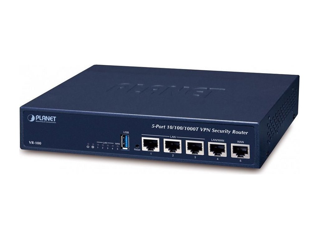 PLANET VR-100Gigabitový router disponující pěti RJ-45 porty pro definici WAN/LAN/DMZ se snadným a rychlým nastavením pomocí webového rozhraní. Zařízení s profesionálním firewallem umožňující vícenásobné připojení k internetu s možností rozdělení zátěže nebo vytvoření zálohy pro připojení. Je ideálním zařízením s firewallem a podporou SD-WAN pro střední a malé společnosti, kterým poskytne redundantní spojení k internetu, zároveň řeší aplikace bezpečného vzdáleného připojení k vzdáleným sítím a ochranu před útoky z internetu, disponuje pokročilým firewallem s detekcí nestandardních IP provozů, dále možností řízení přenosového pásma pomocí pravidel QoS a statistikou přenesených dat. Spojení mezi lokálními sítěmi nebo pro externí klienty zajistí integrovaný VPN server, šifrování podporuje integrovaný hardware akcelerátor.