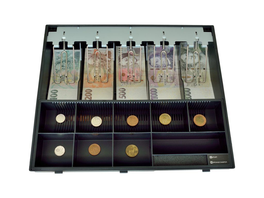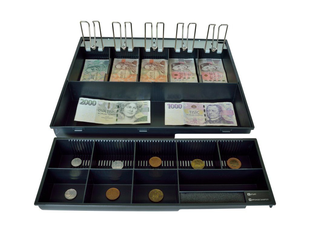 Dostatečně široký pořadač pro pohodlné umístění 5 druhů bankovek vedle sebe. Obsahuje vyjímatelný mincovník a pořadač bankovek s libovolně nastavitelnými přihrádkami. Pořadač disponuje kovovými držáky bankovek a je možné jej doplnit o uzamykatelný kryt EPP12050.