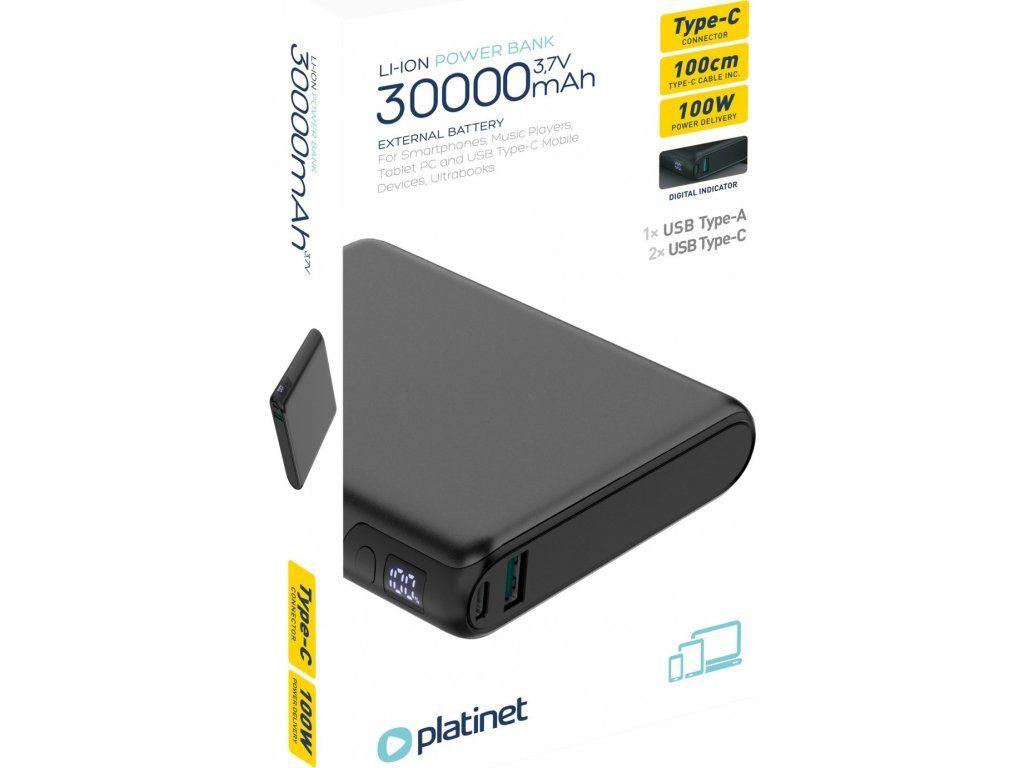 Platinet Powerbanka 30000 mAh 100W Power Delivery, 2xUSB-C, 1xUSB-A, černá