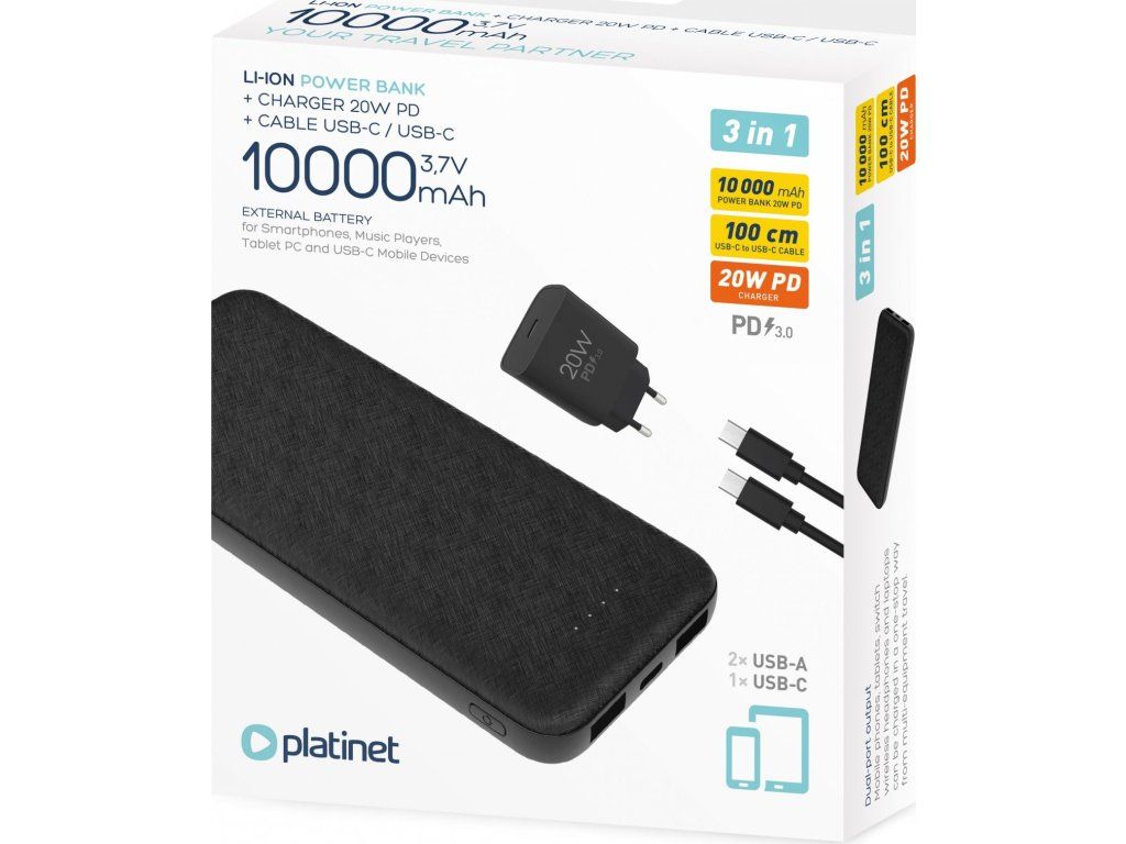 Platinet SET 3v1 Powerbanka 10000 mAh + Nabíječka 20W Power Delivery, kabel USB-C 1m, černá