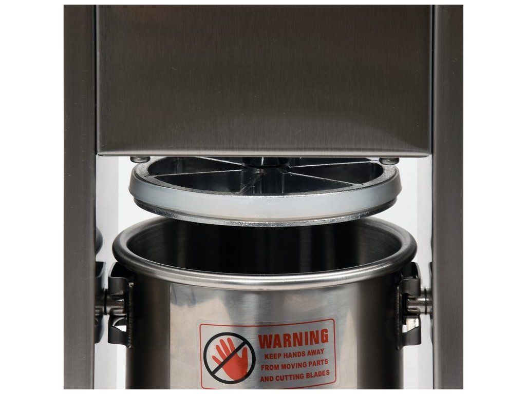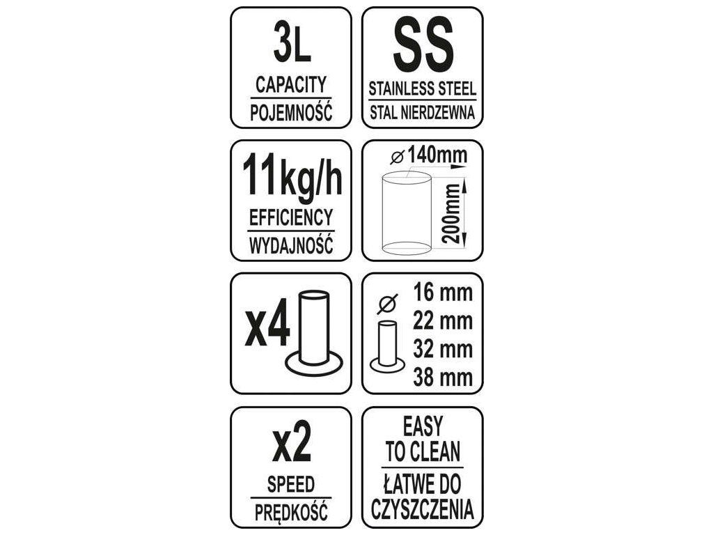 Nádrž se všemi ostatními prvky, které přicházejí do styku s potravinami, jsou vyjímatelné, což vám umožní udržovat je řádně čisté. Zařízení obsahuje 4 vyměnitelné trychtýře o průměru 16 mm / 22 mm / 32 mm / 38 mm. Plnička má svislou konstrukci se stabilní základnou, navíc vybavenou gumovými protiskluzovými nožičkami.