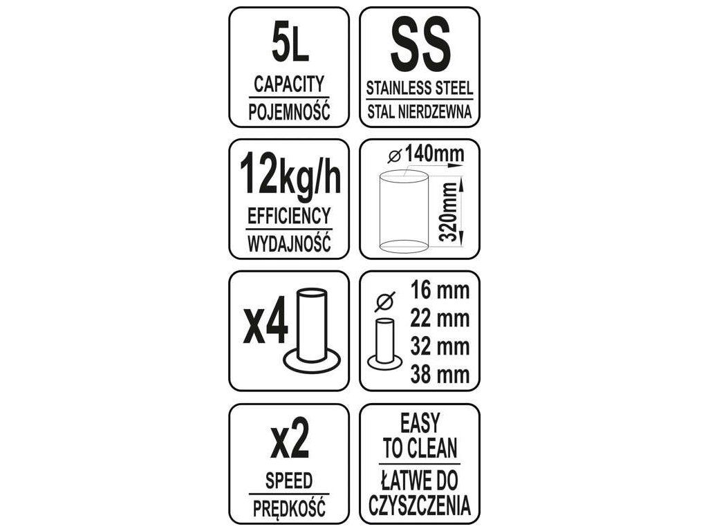 Nádrž se všemi ostatními prvky, které přicházejí do styku s potravinami, jsou vyjímatelné, což vám umožní udržovat je řádně čisté. Zařízení obsahuje 4 vyměnitelné trychtýře o průměru 16 mm / 22 mm / 32 mm / 38 mm. Plnička má svislou konstrukci se stabilní základnou, navíc vybavenou gumovými protiskluzovými nožičkami.