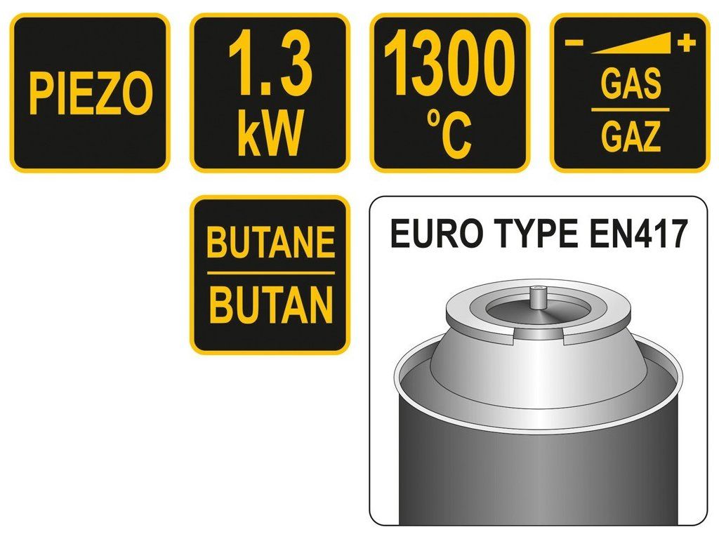 Zařízení je vhodné k přímému připojení k butanové lahvi - v souladu s EN417. Spotřeba plynu je 96 g/h.