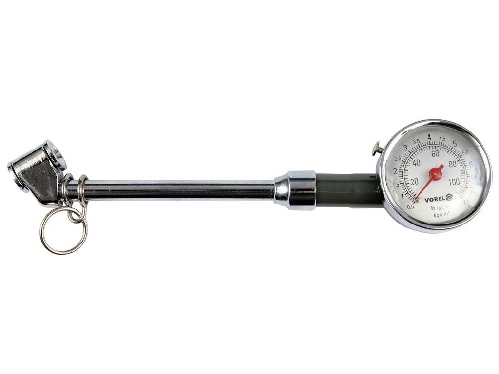 Dlouhý kovový pneuměřič. Měřicí rozsah 0,05-0,75 MPa, 0,5-7,5 bar.