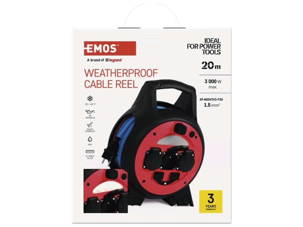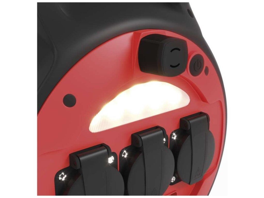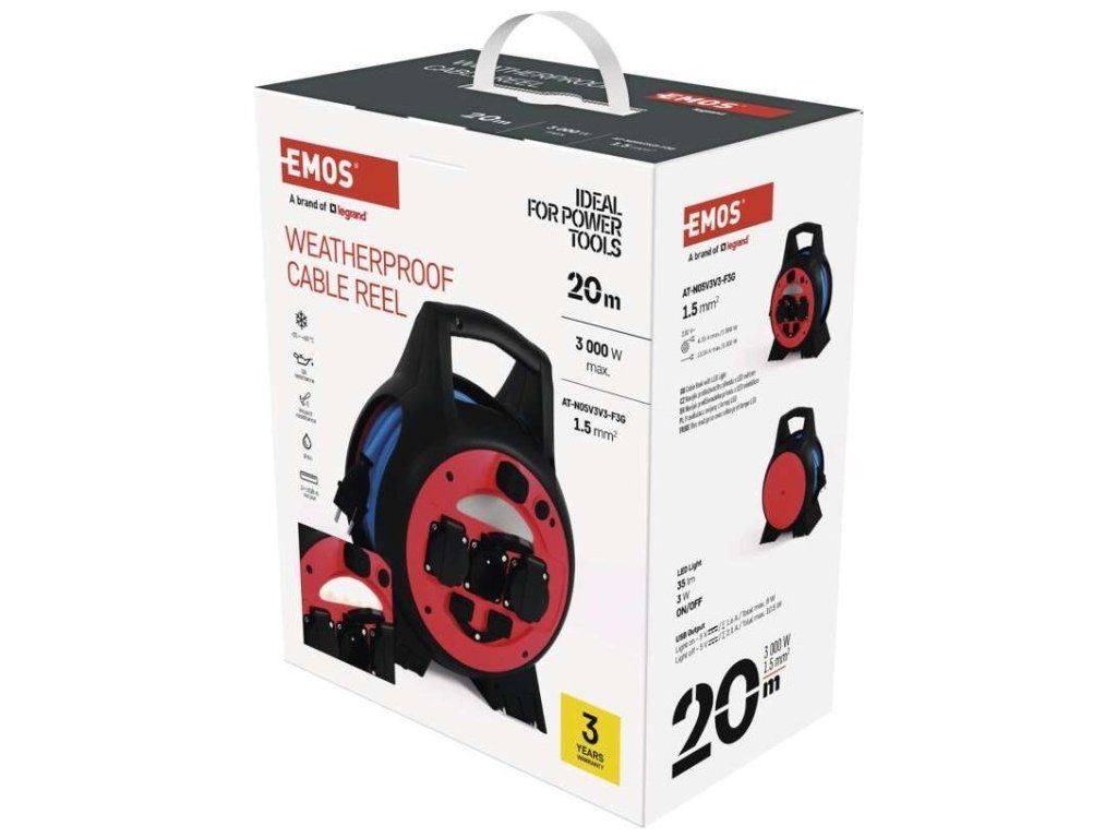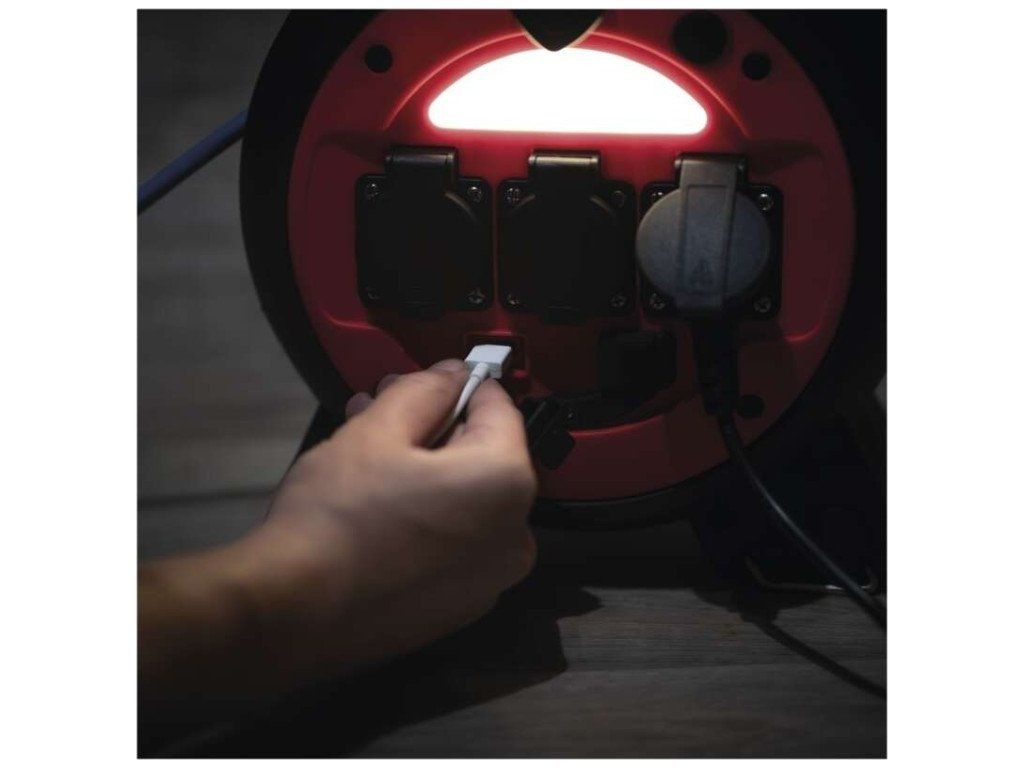 Mrazuvzdorný kabel s plastovou izolací - pro střední namáhání, v prostředí obyčejném, studeném i vlhkém (odolný proti ztíženým klimatickým podmínkám a teplotám až do -35˚C). Je odolný vůči oleji a UV záření. Krytí IP44 umožňuje použití ve venkovním prostředí.Součástí těla navijáků je i LED reflektor 3 W (35 lm), který poslouží pro osvětlení místa navijáku.2× USB typ A ∑2,1 A max.