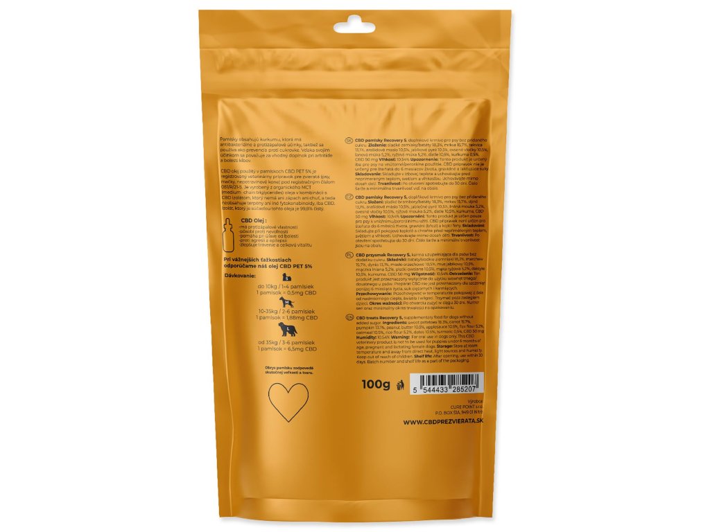 Sladké brambory/batáty 16,3 %, mrkev 15,7 %, dýně 13,1 %, arašídové máslo 10,5 %, jablečné pyré 10,5 %, ovesné vločky 10,5 %, lněná mouka 5,2 %, rýžová mouka 5,2 %, datle 10,5 %, kurkuma 0,5 %, CBD 100 mg, vitamín E (tokoferol) 2,0 %, benzoan sodný.