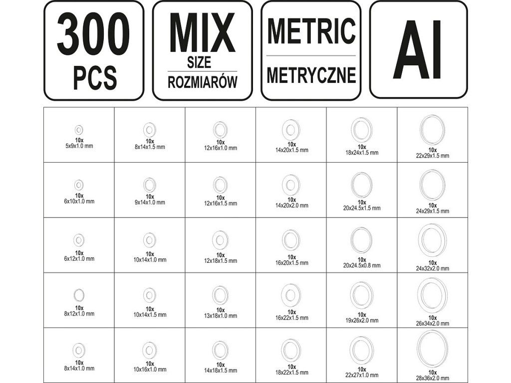 Sada 300 ks kvalitních hliníkových podložek rozměrů od 5 x 9 mm do 28 x 36 mm, dohromady 30 druhů podložek po 10 ks.